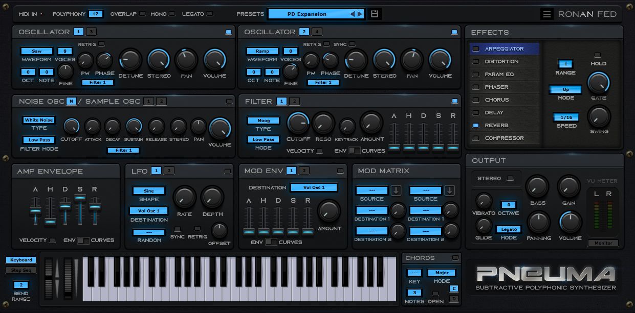 Ronan Fed offers PNEUMA, a FREE subtractive polyphonic synth for Windows. Pneuma a beast of a synth with four multi-voice oscillators, each of which delivers up to eight voices with detune and stereo spread. That should tell you what Pneuma is all about: Fat, massive trance leads and pads are its biggest specialties. It’s also got two sample oscillators, two different filter types, plenty of modulation, an arpeggiator and chord generator, and a comprehensive selection of effects. That’s a whole lot of synth for a free plug-in! click here for more...download additional presets