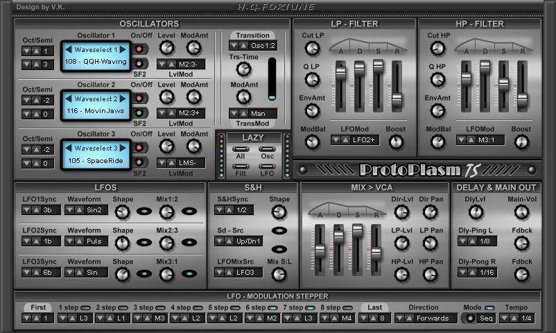 One of the special features of this synthesizer is a very easy to handle modulation-system with 8 LFO/S&H-outputs plus Transition system and Super-Modulation. There are even patternlike LFO-waveforms as modsources so You can do quite amazing and complex modulations with only very few settings. click here for more...